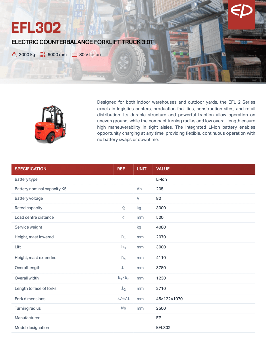 EP Elektrisk Motviktstruck EFL302 – Litium, 3000 kg, 4-hjul