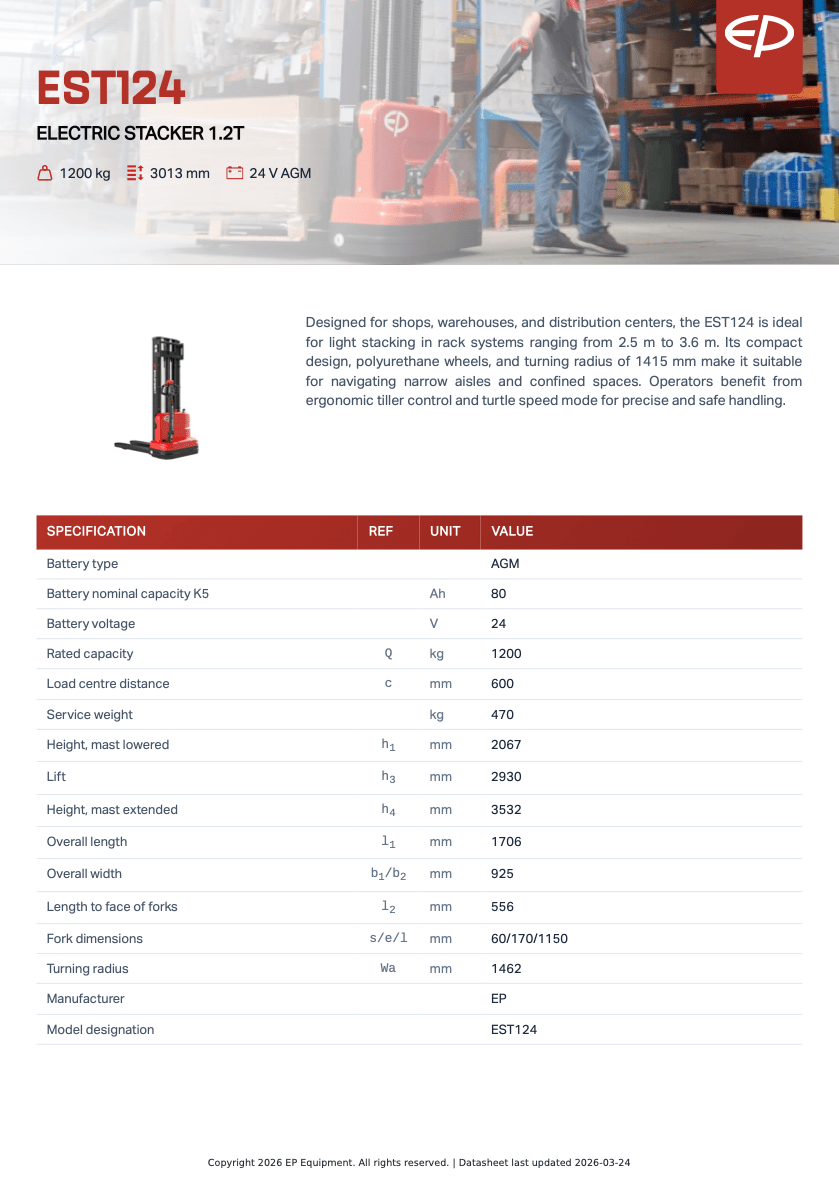 Kontakta oss för offert. EP EST124 är en kompakt elektrisk ledstaplare / truck med 1200 kg kapacitet, 24V AGM-batteri och upp till ca 3600 mm lyfthöjd, utvecklad för effektiv pallhantering i lager, butik och logistik. Med liten svängradie, robust konstruktion och krypkörningsfunktion är den optimal för truckkörning i trånga utrymmen och stapling i ställage.