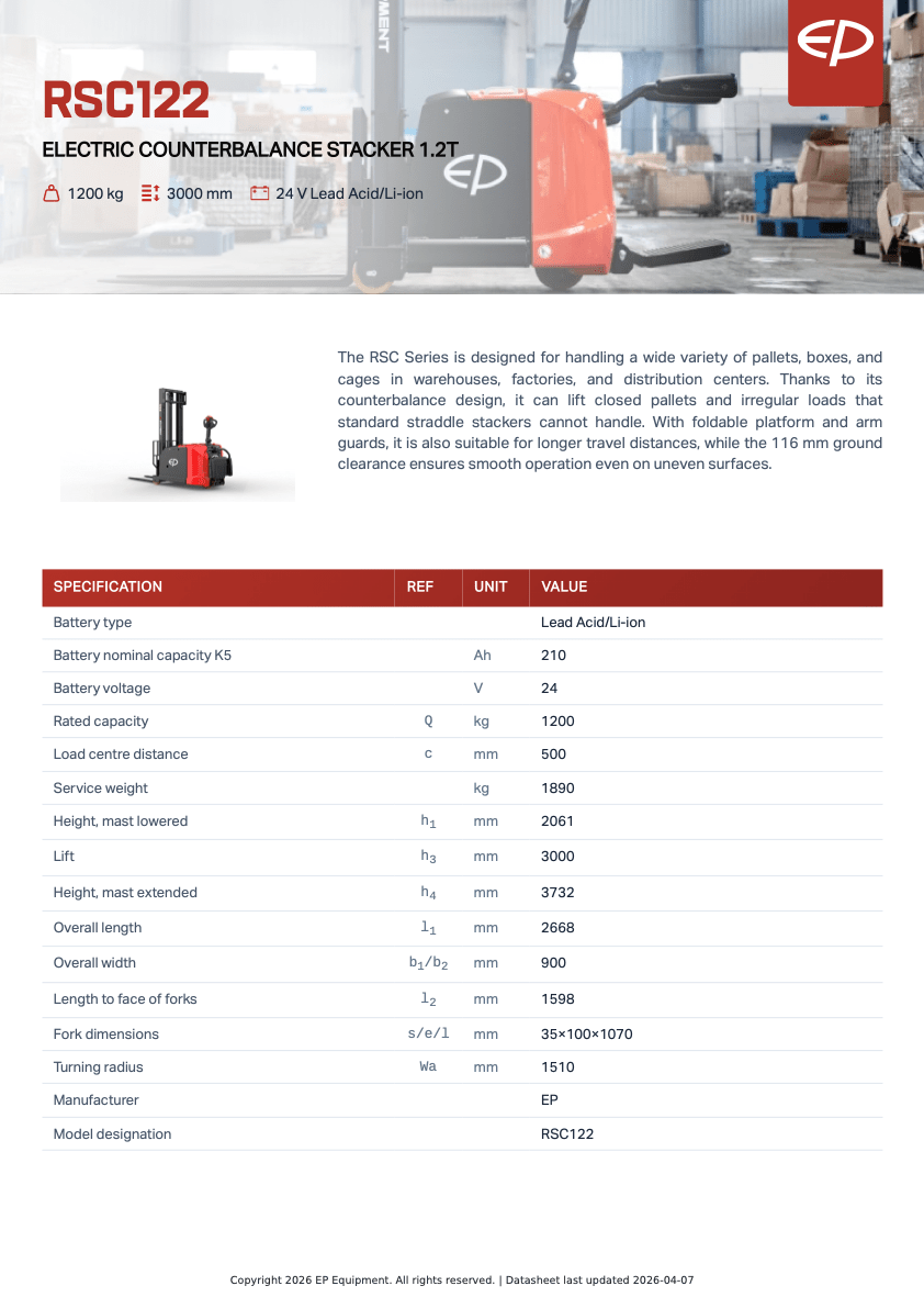 Kontakta för offert. EP RSC122 är en kraftfull elektrisk motviktstruck / ledstaplare med 1200 kg kapacitet, 24V batteri (bly eller litium) och upp till ca 3300 mm lyfthöjd, utvecklad för flexibel pallhantering i lager, industri och logistik. Med motviktsdesign klarar denna truck slutna pallar, burar och oregelbundna laster som vanliga staplare inte hanterar.