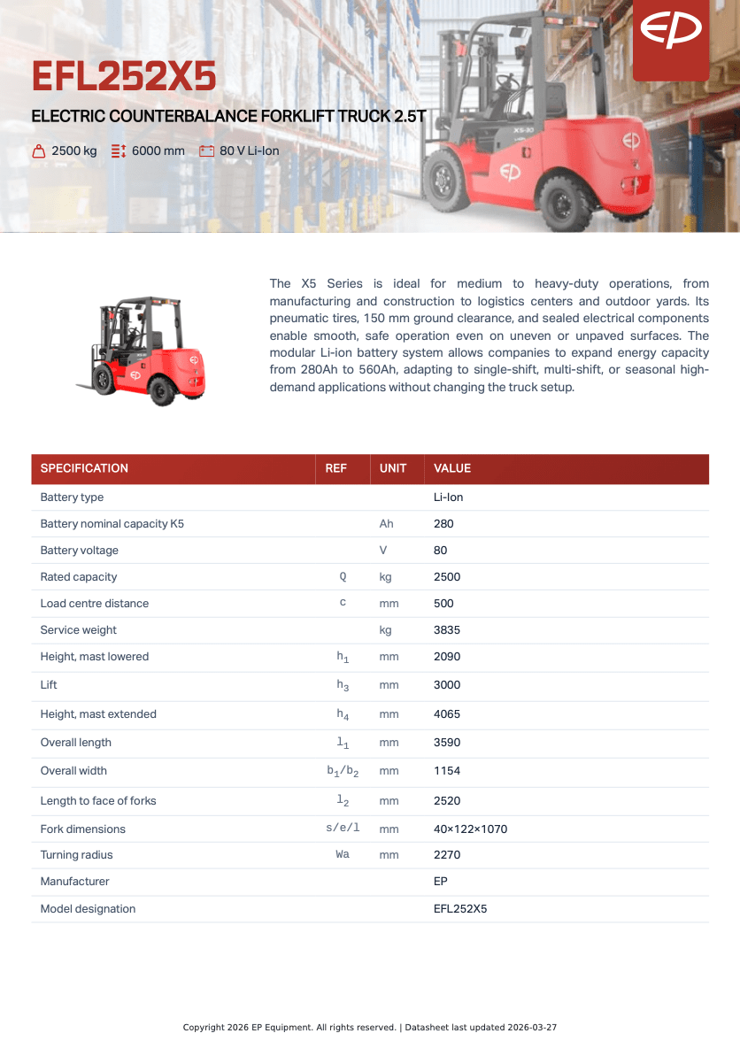 Kontakta oss för offert. EP EFL252X5 är en elektrisk motviktstruck (gaffeltruck) med litiumbatteri, 2500 kg lyftkapacitet och upp till 6000 mm lyfthöjd, utvecklad för medel till tung drift inom lager, industri, bygg och utomhusmiljöer. Med modulärt batterisystem, hög markfrigång och kraftfull prestanda är den optimal för krävande och varierande arbetsförhållanden.