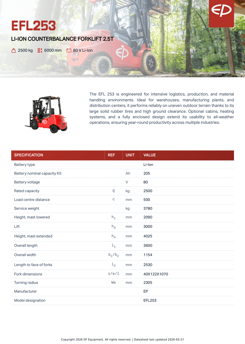 EP Elektrisk Motviktstruck EFL253 – Litium, 2500 kg, 4-hjul