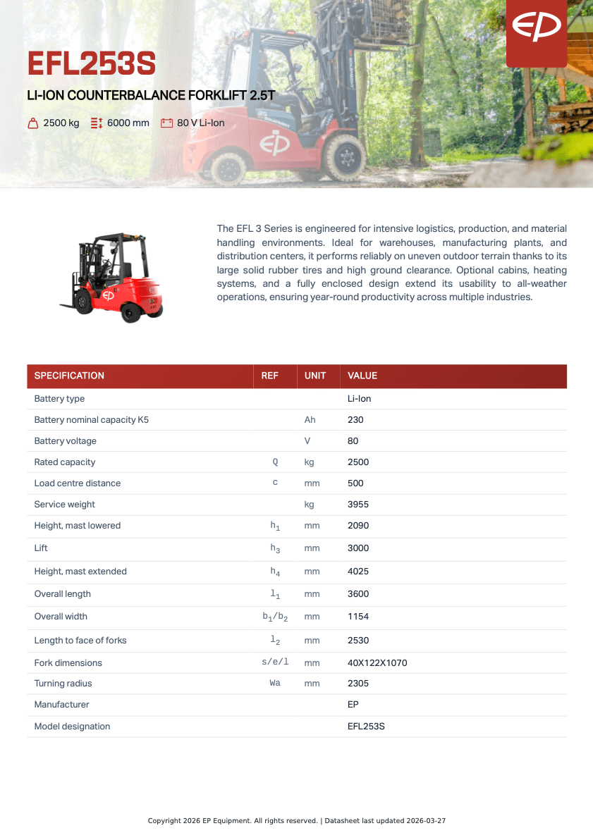 EP Elektrisk Motviktstruck EFL253S – Litium, 2500 kg, 4-hjul