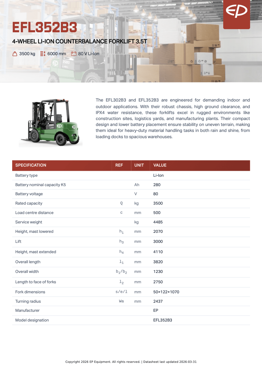 Kontakta för offert. EP EFL352B3 är en elektrisk motviktstruck (gaffeltruck) med litiumbatteri, 3500 kg lyftkapacitet och upp till 6000 mm lyfthöjd, utvecklad för tung materialhantering i både inom- och utomhusmiljöer. Med robust chassi, hög markfrigång och IPX4-klassning är den optimal för bygg, industri, lager och logistik i krävande miljöer.