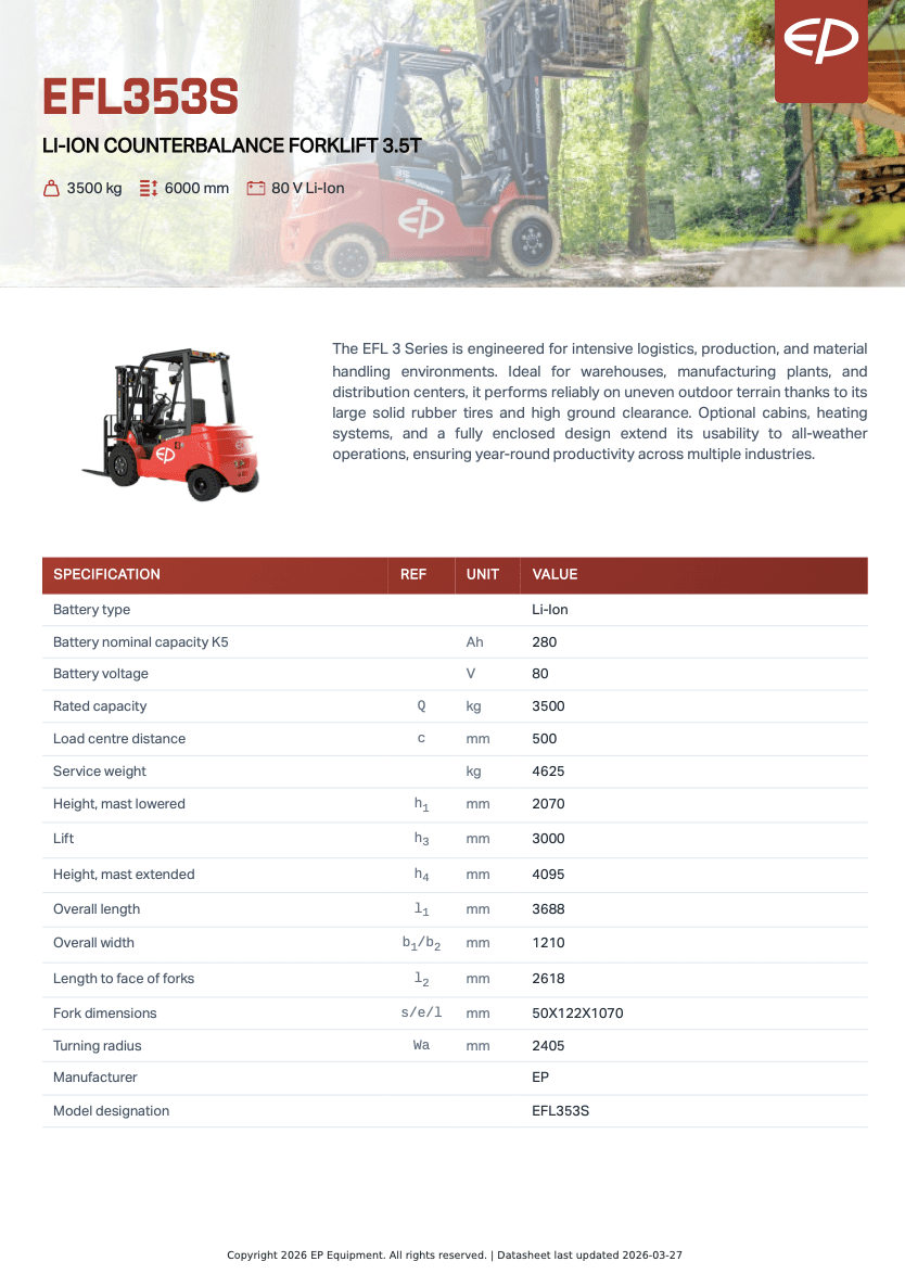 EFL353S är en elektrisk motviktstruck / gaffeltruck framtagen för verksamheter som behöver en driftsäker, flexibel och kostnadseffektiv truck för både inom- och utomhusarbete. Med en lyftkapacitet på 3500 kg är den idealisk för lager, produktion, logistikcenter och materialhantering i varierande miljöer.
